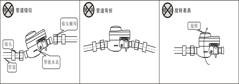 將表接頭套入接頭螺母后安裝到管道上,然后扭轉(zhuǎn)接頭螺母將水表安裝到管道上,保持水表讀數(shù)度盤水平向上,水表與管道連接時不應受過大的折彎力,以免損壞水表接口斷裂。禁止出現(xiàn)如下圖所示的安裝方式: